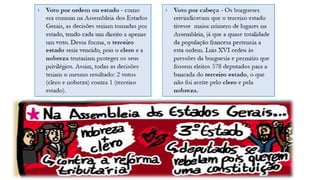A Revolução Francesa (1789-1799) marcou o fim da monarquia absoluta na França e o início de uma sociedade moderna e democrática. O documento descreve os principais eventos da revolução, incluindo a Tomada da Bastilha em 1789, a execução de Luís XVI em 1793, e o período de terror de Robespierre. A revolução influenciou outros países e levou à criação de um governo republicano, antes de Napoleão se tornar imperador em 1804.