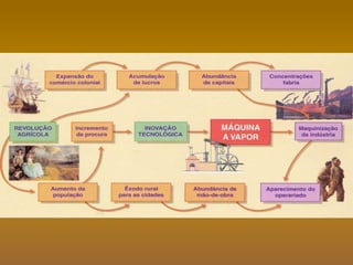 A revolução industrial começou na Inglaterra no final do século XVIII devido às condições favoráveis como matérias-primas, mão-de-obra, mercados coloniais e avanços tecnológicos. A indústria têxtil, principalmente de algodão, foi o primeiro setor a se industrializar, seguido pela metalurgia para atender a demanda por máquinas. A invenção da máquina a vapor por James Watt foi fundamental para impulsionar a revolução industrial.