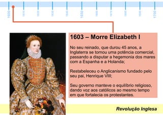 A Revolução Inglesa ocorreu entre 1603 e 1688 e resultou na limitação do poder absoluto do monarca e no fortalecimento do Parlamento. O documento descreve os reinados dos reis ingleses desde Jaime I até Guilherme III, destacando os conflitos entre a monarquia e o Parlamento que levaram à Guerra Civil, execução de Carlos I e estabelecimento da Comunidade da Inglaterra liderada por Oliver Cromwell. A Revolução Gloriosa em 1688 depôs Jaime II e estabeleceu Guilherme III como