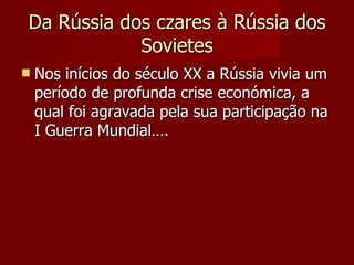 O documento descreve o contexto histórico que levou à Revolução Russa de 1917, incluindo a monarquia czarista repressiva, as desigualdades sociais, o atraso econômico e as revoltas populares. Detalha as revoluções de Fevereiro e Outubro de 1917, que derrubaram o czarismo e instauraram o governo bolchevique de Lenin sob o marxismo. Explora as fases subsequentes da construção da União Soviética, incluindo a guerra civil, o "comunismo de guerra", a Nova