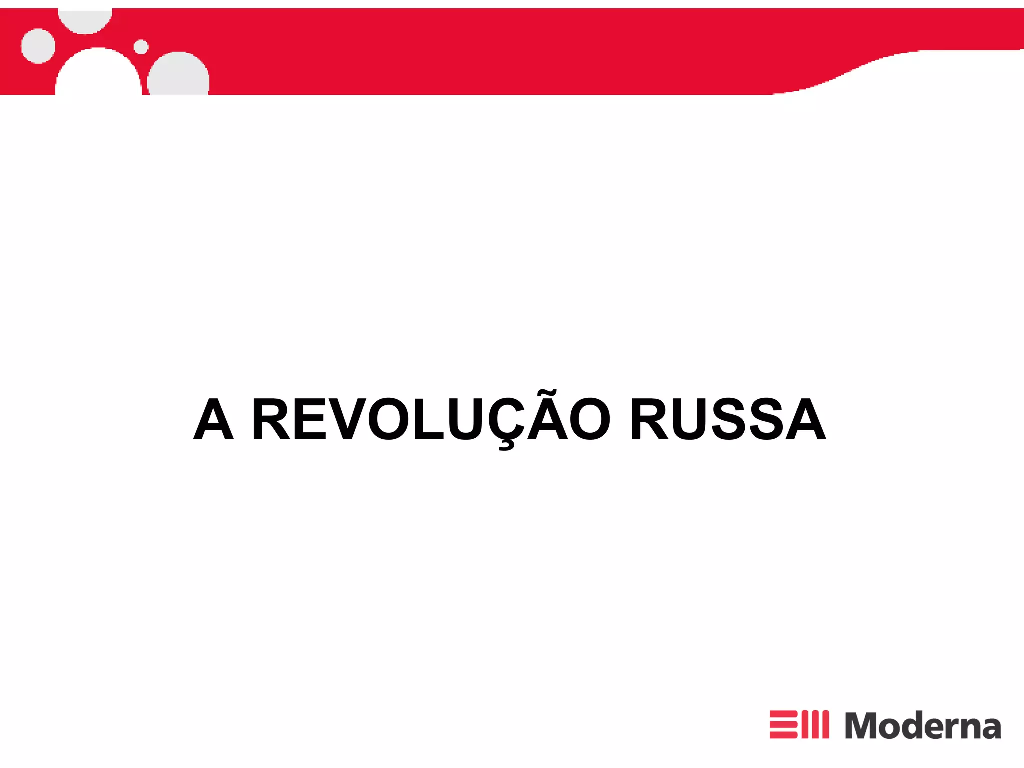O documento descreve a Revolução Russa de 1917, quando os bolcheviques liderados por Lênin tomaram o poder da monarquia czarista. A revolução ocorreu em duas etapas - a Revolução de Fevereiro derrubou o czar e instaurou um governo provisório, enquanto a Revolução de Outubro colocou os bolcheviques no poder. O documento também discute as políticas agrária e econômica implementadas pelo novo governo bolchevique nos anos seguintes.