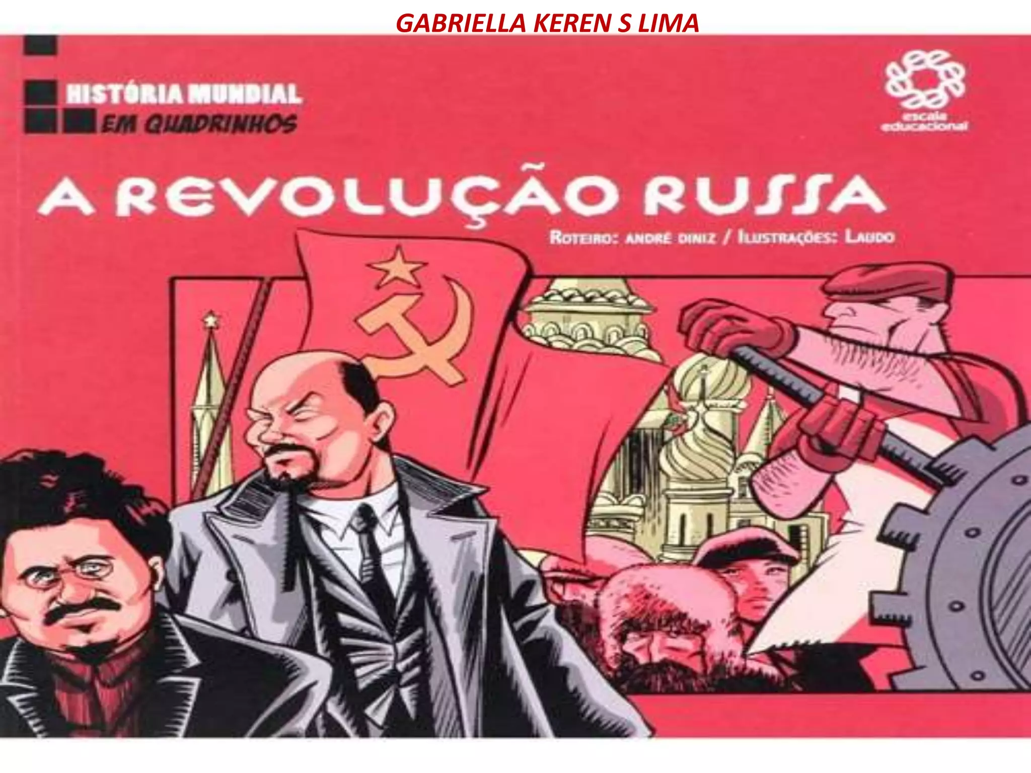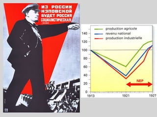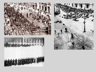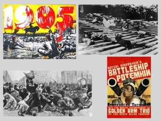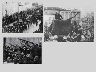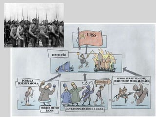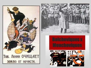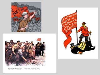 O documento descreve o contexto histórico da Rússia Czarista e os antecedentes que levaram às revoluções de 1905 e 1917. Apresenta os principais acontecimentos dessas revoluções e as medidas implementadas pelos bolcheviques após a tomada do poder, como a saída da guerra e a nacionalização de empresas. Também resume a disputa pelo poder após a morte de Lênin entre Trotsky e Stalin.