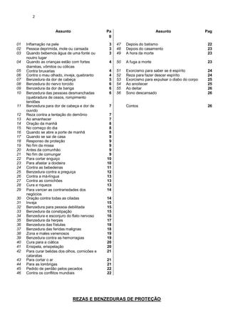 Este documento apresenta várias rezas e benzeduras populares utilizadas no interior de Portugal para tratar de doenças, afastar maus olhados e proteger contra bruxarias. Inclui orações para inflamações na pele, depressão, dores de cabeça, vómitos em crianças, quebranto e mau olhado, entre outros. Muitas envolvem a repetição de frases curativas e a invocação de santos para afastar males e proteger a saúde física e espiritual das pessoas.