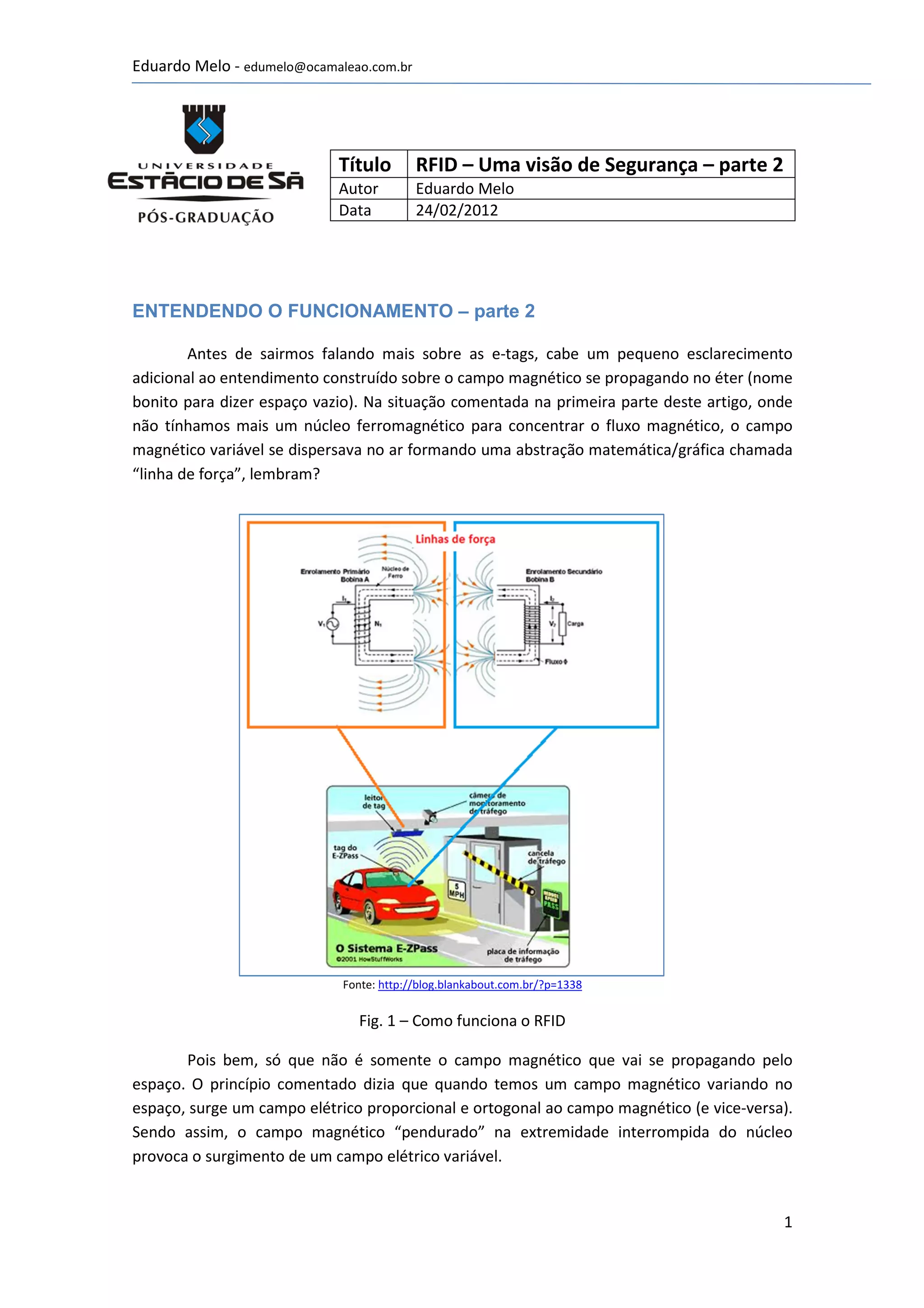 O documento discute como os sistemas RFID funcionam e como eles podem ser vulneráveis à interceptação de dados. Explica que os campos eletromagnéticos transmitem informações entre leitores e etiquetas RFID, e que esses dados podem ser capturados por dispositivos que detectam esses campos. Isso permite clonar etiquetas RFID e obter acesso não autorizado a sistemas que usam RFID.