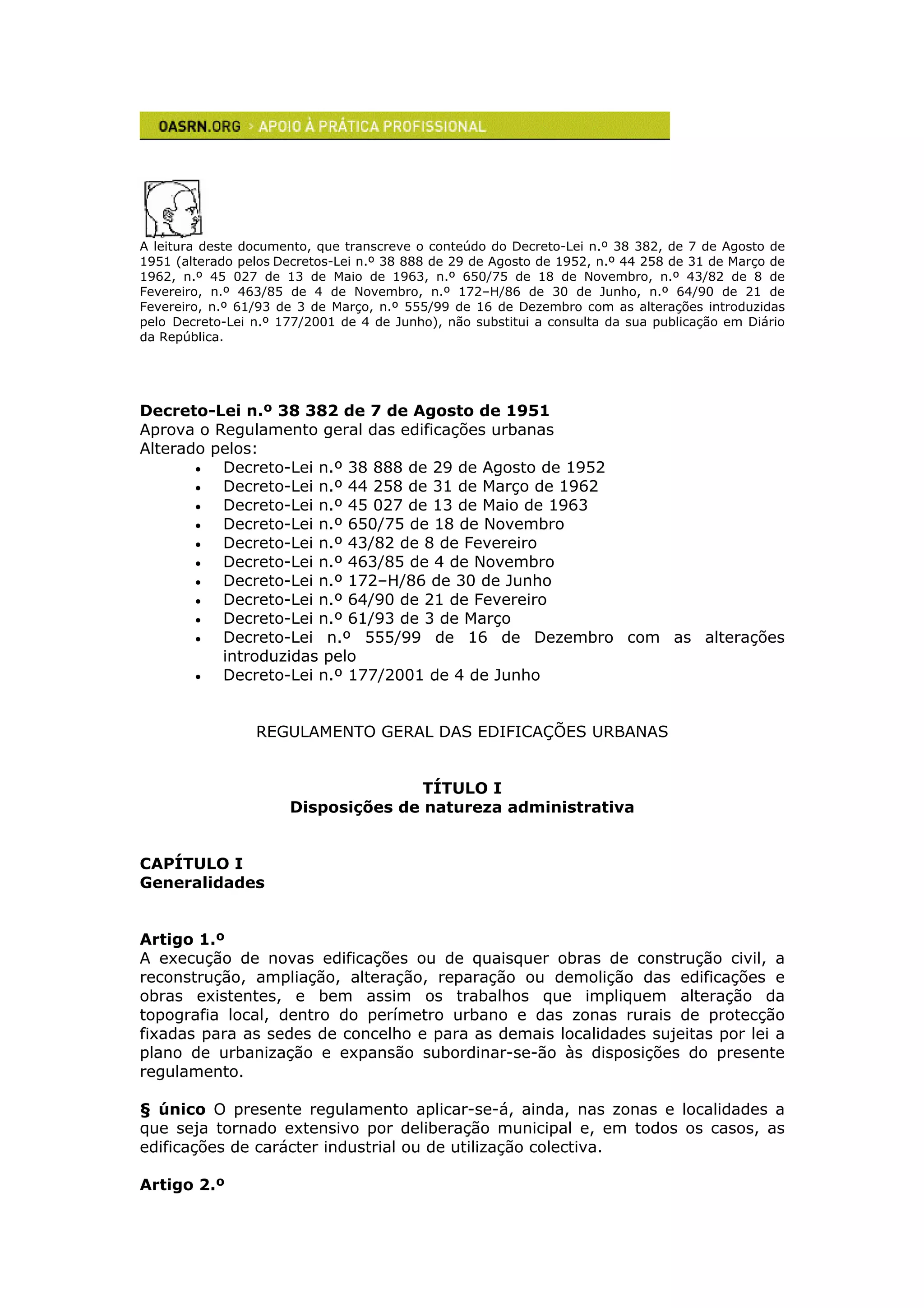 Este documento descreve as alterações feitas ao Decreto-Lei n.o 38 382 de 7 de Agosto de 1951, que aprovou o Regulamento Geral das Edificações Urbanas. Foram feitas várias alterações a este decreto por outros decretos-lei posteriores, sendo a última alteração feita pelo Decreto-Lei n.o 177/2001 de 4 de Junho. O documento transcreve o conteúdo original do Regulamento Geral das Edificações Urbanas.