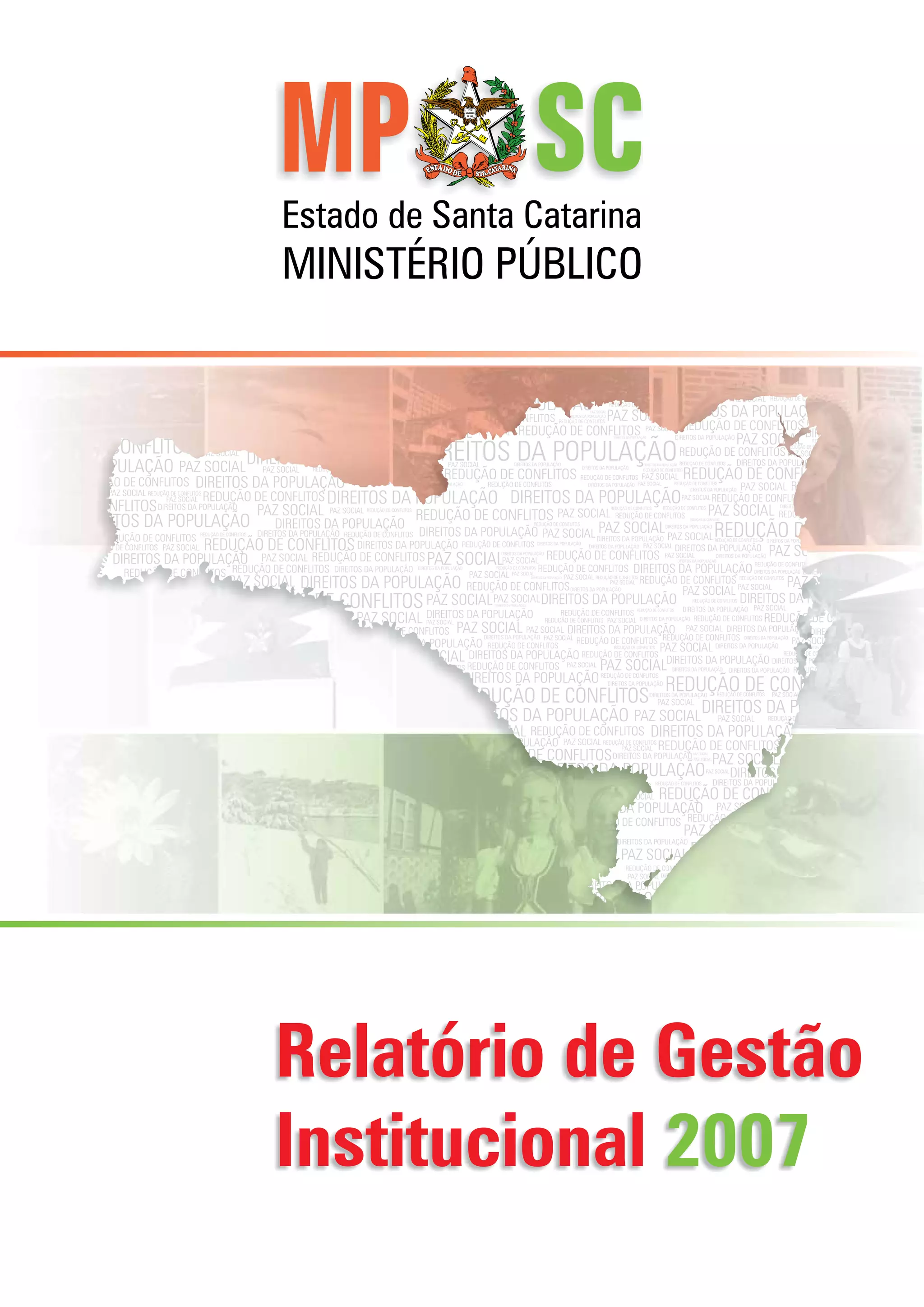 O documento é um relatório de gestão institucional do Ministério Público de Santa Catarina em 2007. O relatório destaca os esforços da administração para melhorar a atuação da instituição através de novas diretrizes, como a reformulação do plano de atuação com participação dos membros, a criação de grupos de apoio para combater crimes de agentes públicos e a campanha de boas práticas para economizar recursos públicos e proteger o meio ambiente.