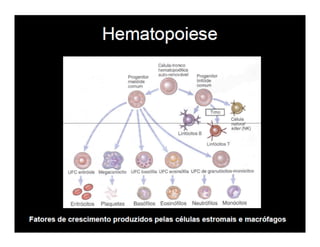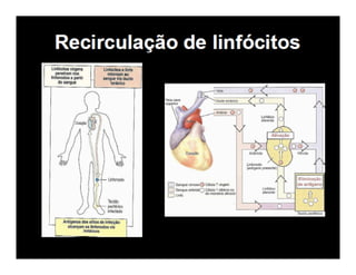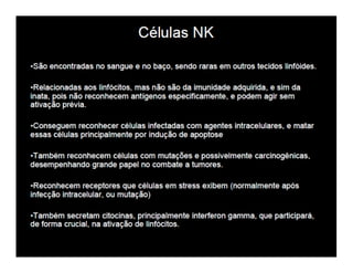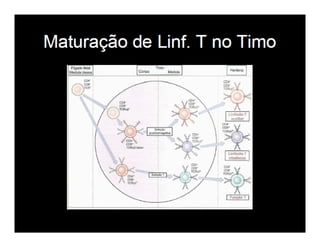 O documento descreve os principais órgãos e células do sistema imunológico, incluindo: (1) a diferenciação dos linfócitos T em subpopulações Th1, Th2 e Th17 que secretam citocinas diferentes; (2) a ativação dos linfócitos T CD8+ e B; (3) os principais órgãos linfóides como medula óssea, baço e linfonodos.