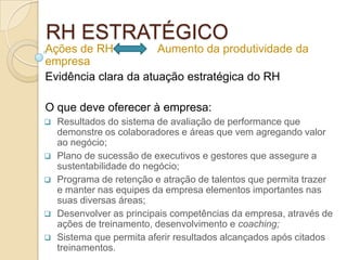 O documento discute as ações estratégicas que o RH deve tomar para aumentar a produtividade da empresa, como avaliação de desempenho, sucessão de executivos, retenção e atração de talentos, e desenvolvimento de competências. Também lista ações como promover a visão da empresa, recrutar profissionais qualificados, programas de ética e comunicação, e interagir com universidades.