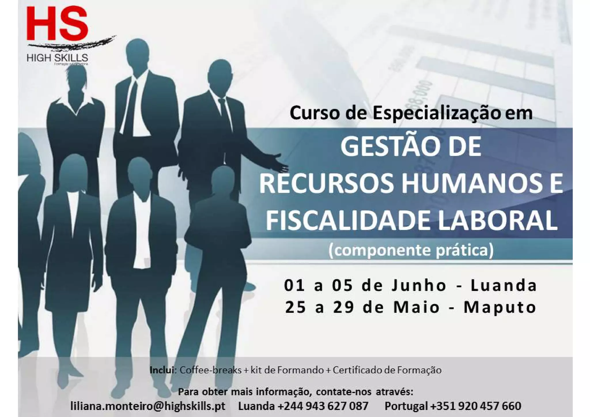 LUANDA e MAPUTO GESTÃO de RECURSOS HUMANOS e FISCALISDADE LABORAL (COMPONENTE PRATICA) Mais informações ao cuidado de LILIANA MONTEIRO: Email: liliana.monteiro@highskills.pt Luanda +244 943 627 087 Portugal +351 920 457 660