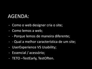 O documento discute como os designers criam sites versus como os usuários realmente navegam e leem sites. Ele argumenta que os usuários raramente lêem tudo e, em vez disso, varrem rapidamente em busca de informações relevantes. O documento também discute a importância de testar sites com usuários desde o início para melhorar a experiência do usuário.