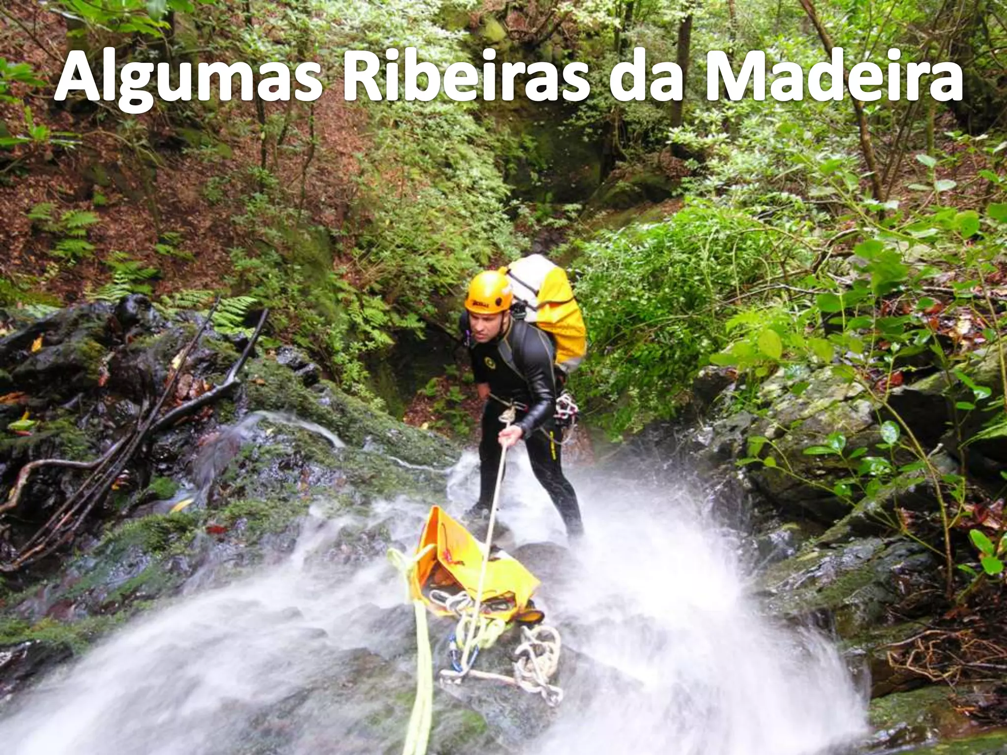 O documento descreve várias ribeiras localizadas na Ilha da Madeira, incluindo a Ribeira de Santa Luzia em Funchal coberta por buganvíleas coloridas, a Ribeira do Tristão com imponência geológica e floresta Laurissilva preservada, e fotos de outras ribeiras como a Ribeira Grande.