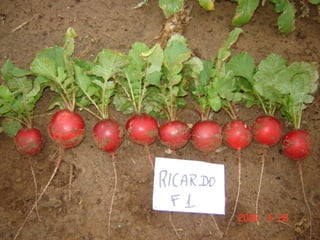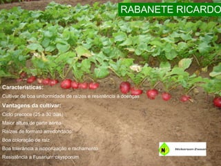 O documento fornece informações sobre três cultivares de hortaliças: Rabanete Ricardo, uma cultivar de rabanete com ciclo precoce e resistência a doenças; Couve-flor Bromus, uma cultivar de couve-flor de meia-estação com cabeças roxas e resistência a Xanthomonas; e Repolho Roxo Romanov, uma cultivar de repolho roxo vigorosa e resistente a doenças foliares.