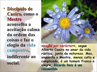 Ricardo Reis foi um poeta português discípulo de Alberto Caeiro. Seu estilo poético propunha a contemplação intelectual da realidade e a aceitação calma da ordem das coisas, embora de forma mais calculada e reflexiva do que Caeiro. Sua filosofia combinava elementos do epicurismo, como aproveitar cada momento, e do estoicismo, como aceitar o destino de forma digna.