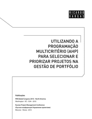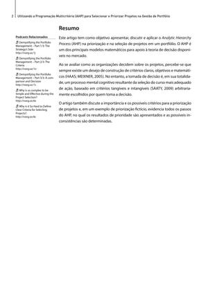 1) O documento discute o uso da técnica de programação multicritério AHP para priorizar e selecionar projetos em portfólios de gestão de projetos.