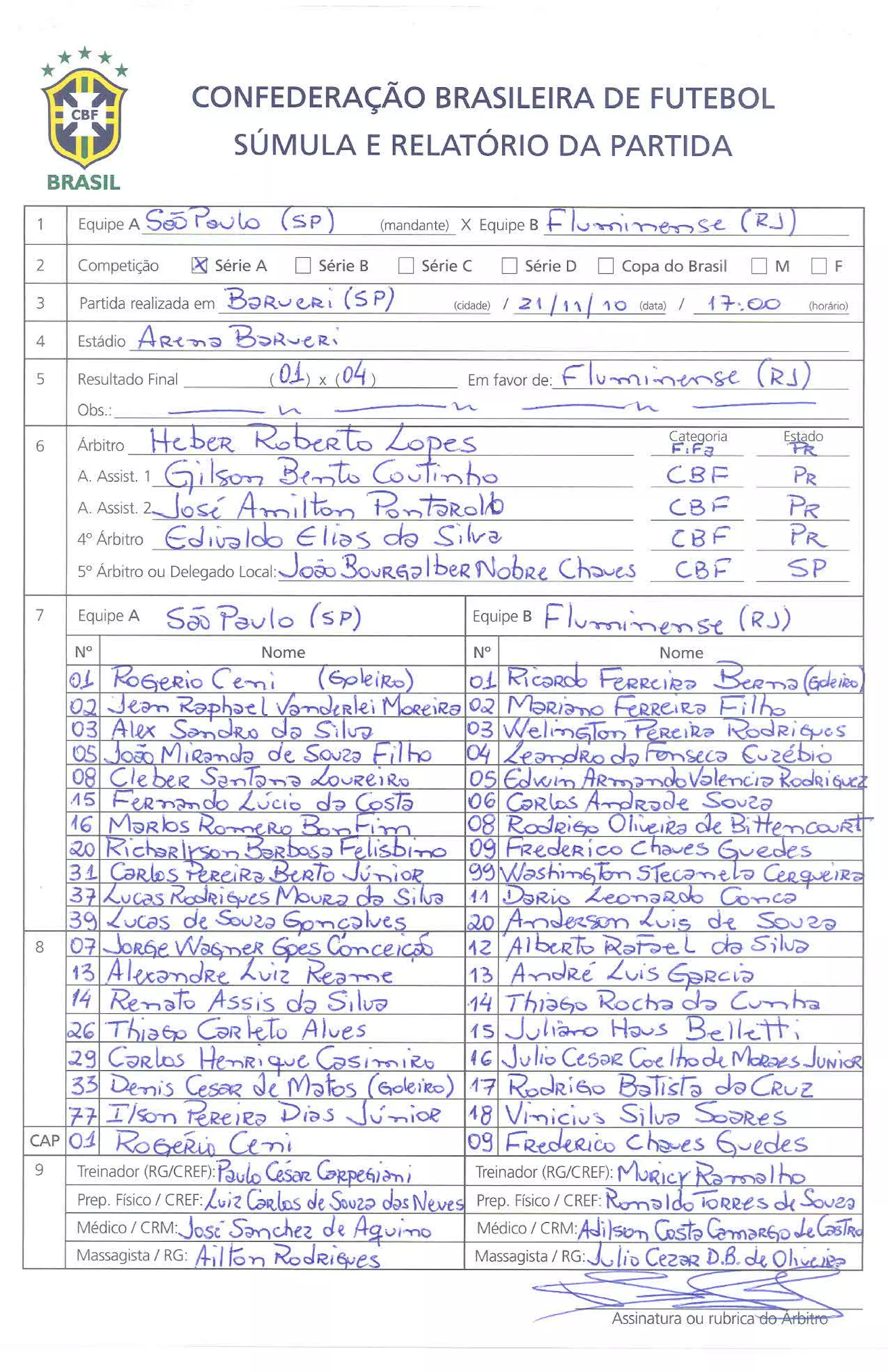 Veja a súmula do jogo São Paulo X Fluminense, onde o Flu venc