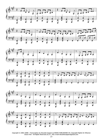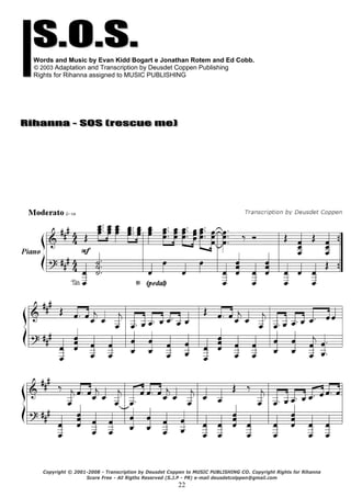 O documento descreve os direitos autorais da música "S.O.S. (Rescue Me)" de Rihanna. Ele lista os compositores originais e a empresa de publicação musical que detém os direitos autorais da música, bem como as informações de contato do transcritor.