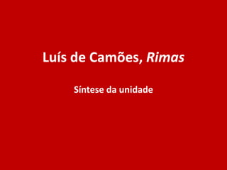 O documento fornece um resumo da unidade lírica de Luís de Camões, abordando os principais temas, influências literárias e características formais. Os temas predominantes incluem a representação da amada e da natureza, a experiência do amor e reflexão sobre a vida pessoal e o desconcerto. A lírica de Camões é influenciada pela tradição e pelo classicismo, utilizando a redondilha e o decassílabo.