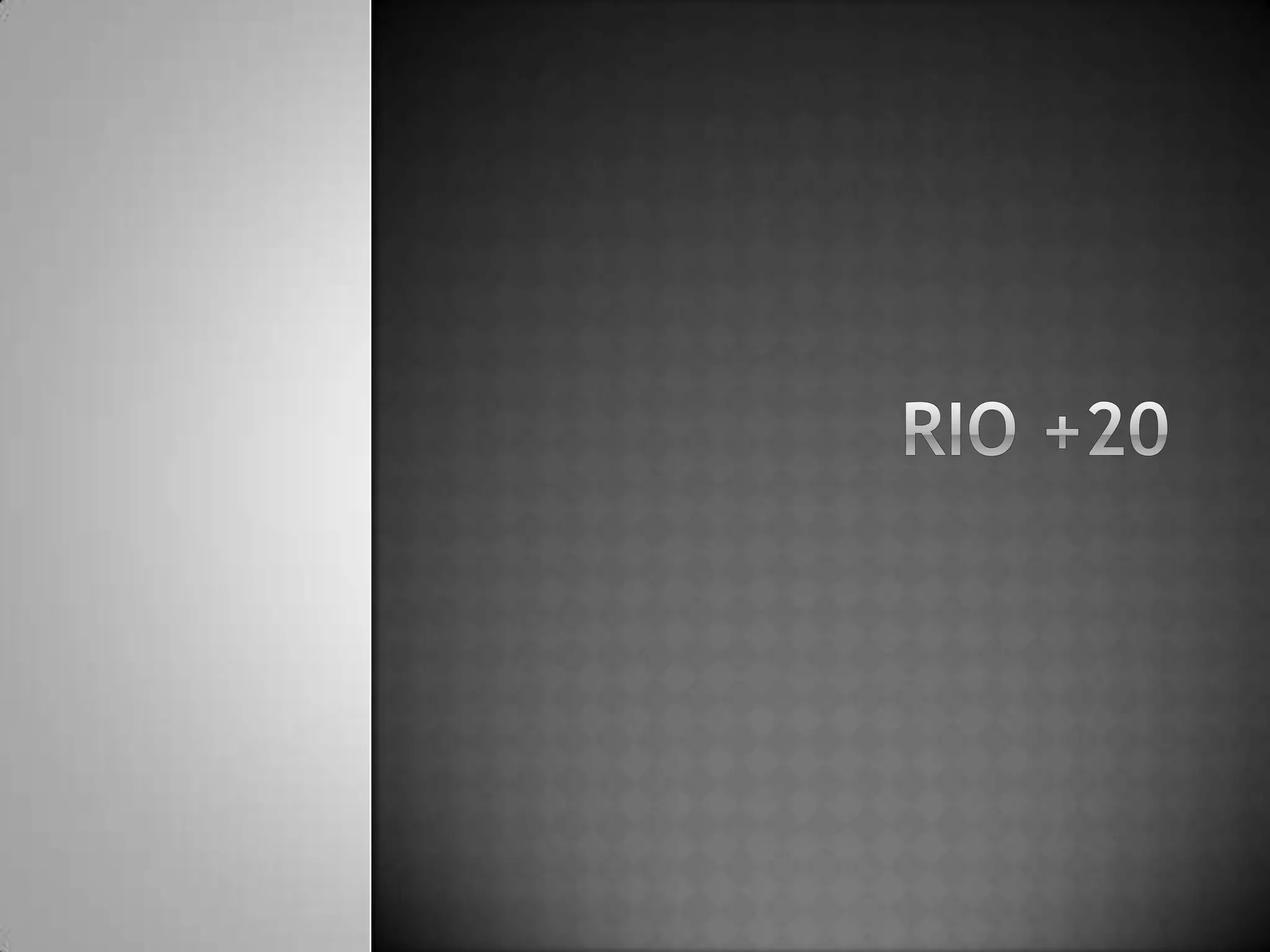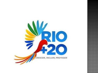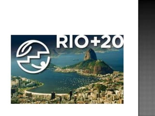 O documento descreve a Rio+20, uma conferência das Nações Unidas sobre sustentabilidade realizada no Rio de Janeiro em 2012 para comemorar os 20 anos da Eco-92 e definir a agenda do desenvolvimento sustentável para as próximas décadas, abordando tópicos como economia verde e instituições para o desenvolvimento sustentável.