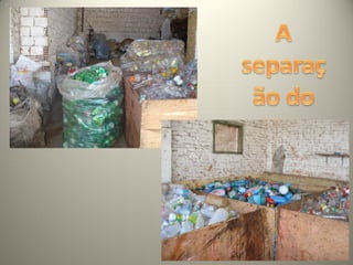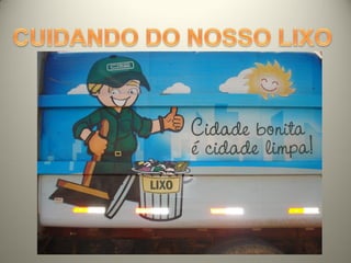 O documento descreve o processo de coleta e tratamento de lixo orgânico e reciclável, começando com caminhões especializados que recolhem os materiais e os levam para uma estação de triagem, onde são empacotados e enviados para áreas próprias para cada tipo de resíduo.