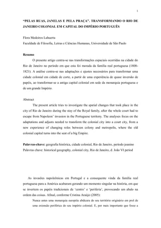 O documento descreve as transformações espaciais na cidade do Rio de Janeiro após se tornar a capital do Império Português em 1808. A chegada da família real e de 10 mil pessoas gerou adaptações, como desalojamento de moradores e ampliação de palácios. Traços coloniais como as rótulas nas janelas foram eliminados para que a cidade parecesse mais "civilizada" e cortesã.