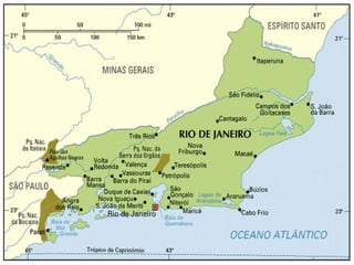 O Rio de Janeiro está localizado na baía de Guanabara, entre montanhas e morros, com clima quente e úmido. A cidade possui importantes pontos turísticos como o Cristo Redentor e o Pão de Açúcar, mas também enfrenta problemas ambientais como a poluição da baía por vazamentos de óleo.