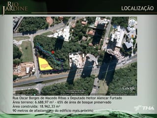 O documento descreve um empreendimento residencial com 64 unidades, localizado em uma área de 6.688m2 com 65% de área verde preservada. O empreendimento terá 35 pavimentos com apartamentos de 3 a 4 quartos, além de amplas áreas comuns internas e externas como piscina, quadra, playground e bosque.