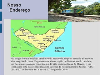 O documento apresenta informações sobre Rio Largo, um município brasileiro em Alagoas, destacando sua localização geográfica, dados populacionais, climáticos e históricos. A cidade, com uma rica herança industrial e agrícola, foi oficialmente criada em 1830 e possui um IDH de 0,671 e uma rede de ensino com 44 unidades. Rio Largo também é conhecido por sua cultura e celebrações, como a comemoração da emancipação política em 13 de julho.
