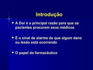 O documento discute o controle da dor como um cuidado farmacêutico importante. A dor é frequentemente a principal razão para pacientes procurarem médicos. O documento explica como medir a dor, classificá-la, e as barreiras no tratamento da dor, incluindo relutância de pacientes e profissionais de saúde. O manejo farmacológico da dor crônica objetiva controlar a dor e melhorar a função do paciente.