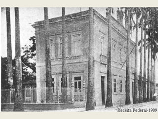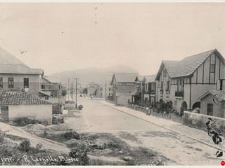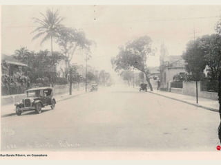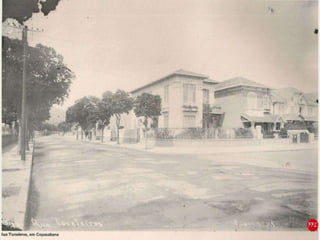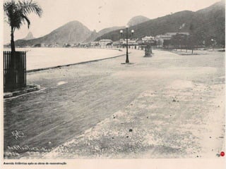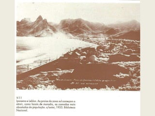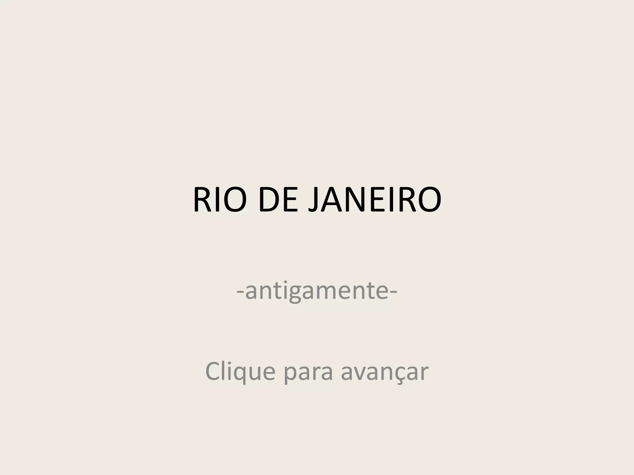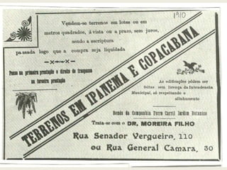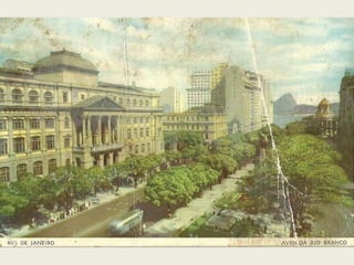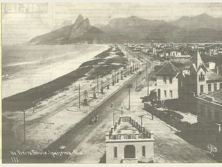 O documento apresenta fotos históricas do Rio de Janeiro de 1880 a 1969, mostrando aspectos da cidade como o Jardim Botânico, Ipanema, Copacabana e outros bairros ao longo do tempo, incluindo imagens de ruas, praias, transportes e construções.