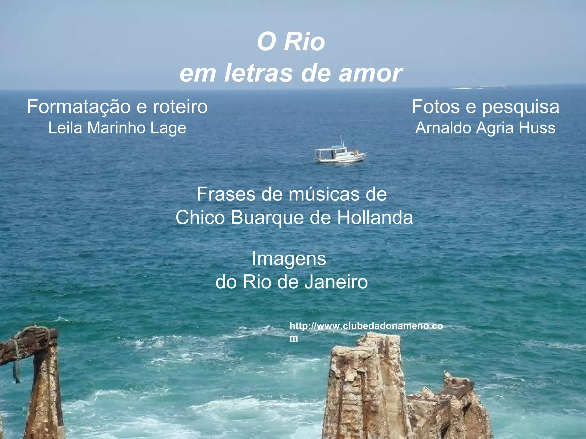 Este documento apresenta um roteiro e imagens de locais do Rio de Janeiro acompanhados por músicas de Chico Buarque. As fotos mostram paisagens famosas como o Pão de Açúcar, a Lagoa Rodrigo de Freitas e a Praia Vermelha, enquanto as letras das músicas descrevem aspectos da cidade e do amor. O documento tem como objetivo promover a obra musical de Chico Buarque através de imagens que ilustram suas canções sobre o Rio de Janeiro.