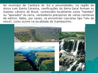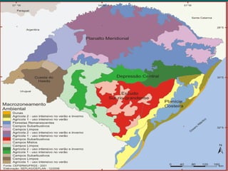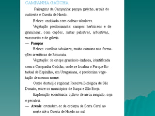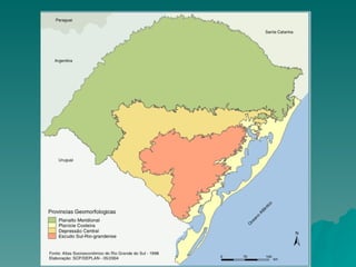 1) O documento descreve as principais unidades geomorfológicas do Rio Grande do Sul, incluindo o Planalto Norte-Rio-Grandense, a Depressão Central e o Planalto Sul-Rio-Grandense.