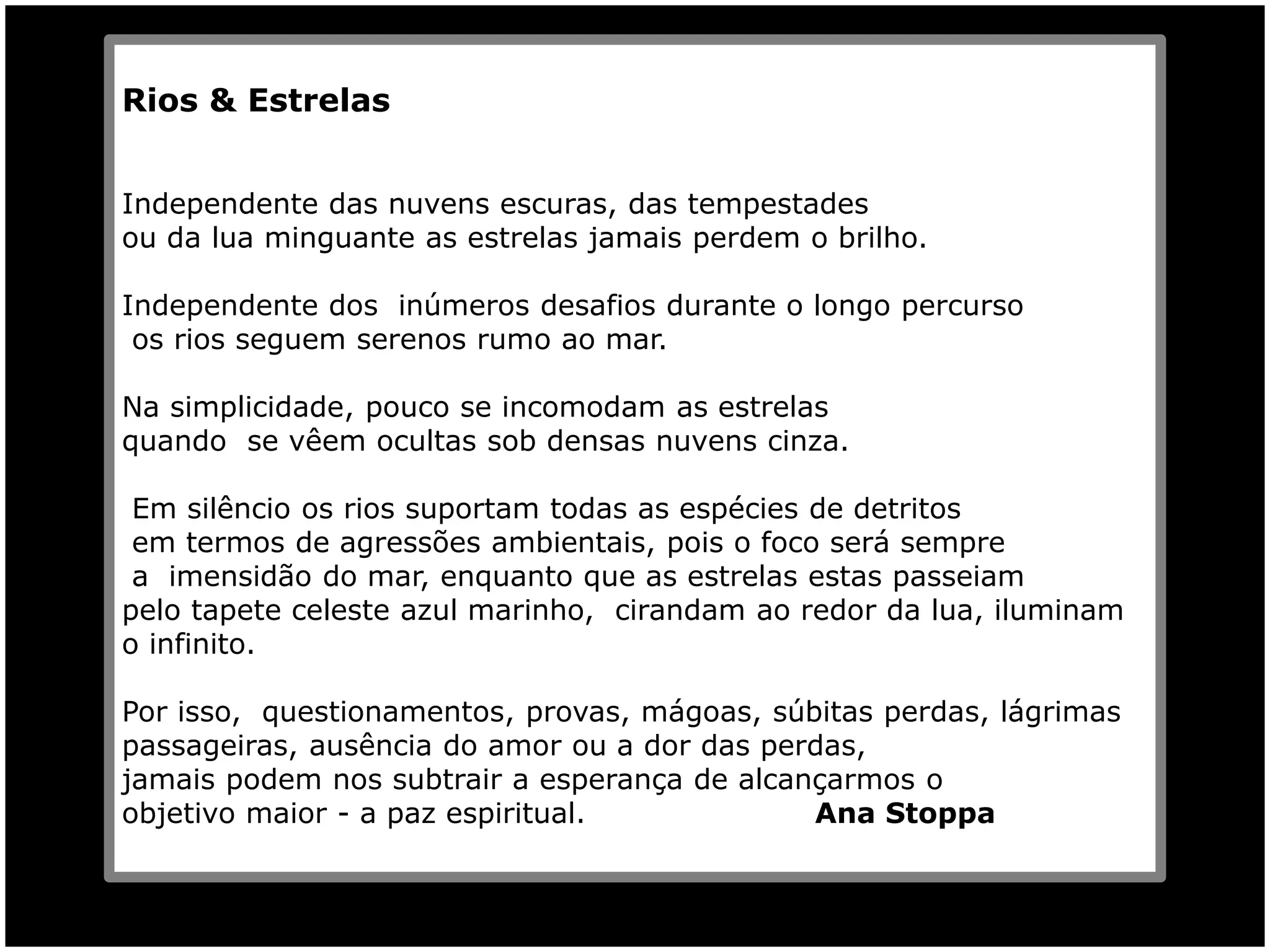 O poema compara as estrelas e os rios, que permanecem firmes e seguem seu caminho independentemente dos desafios, como as nuvens escuras e tempestades para as estrelas, e os detritos e agressões ambientais para os rios. Da mesma forma, as pessoas devem manter a esperança e foco em seus objetivos maiores, como a paz espiritual, apesar dos questionamentos e provas da vida.