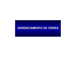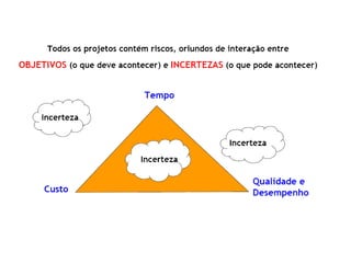 O documento discute o conceito de risco, definindo-o como a possibilidade de um projeto não atingir seus objetivos devido a desvios, e que implica não apenas em prejuízo, mas também em ganho. Ele também descreve estratégias de gerenciamento de risco como mitigação, aceitação, transferência e contenção de riscos. Por fim, discute a importância de planejamento prévio para administração de crises, incluindo levantamento de riscos e diagnóstico de ameaças.