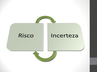 O documento discute riscos relacionados à gestão de projetos e fornece estatísticas sobre riscos à saúde e segurança. Ele também explica por que as organizações assumem riscos e discute princípios e processos de gerenciamento de riscos, incluindo identificação, avaliação, tratamento e monitoramento de riscos.