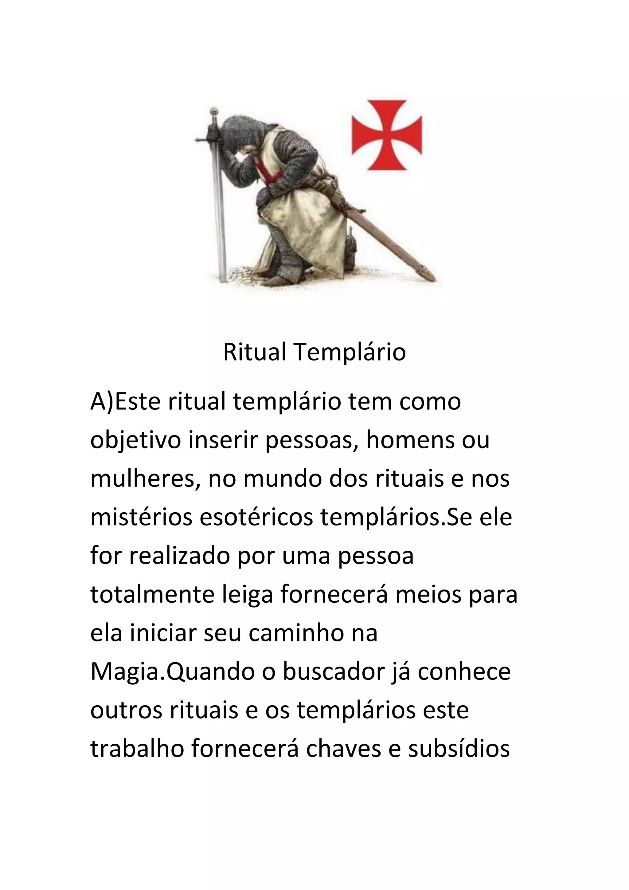 Este ritual tem como objetivo inserir pessoas no mundo dos rituais templários e esotéricos, fornecendo meios para iniciar o caminho na magia ou subsídios para criar outros sistemas. O ritual envolve vestimentas, objetos e orações para criar uma atmosfera para a manifestação do espírito e egrégora templária.