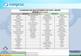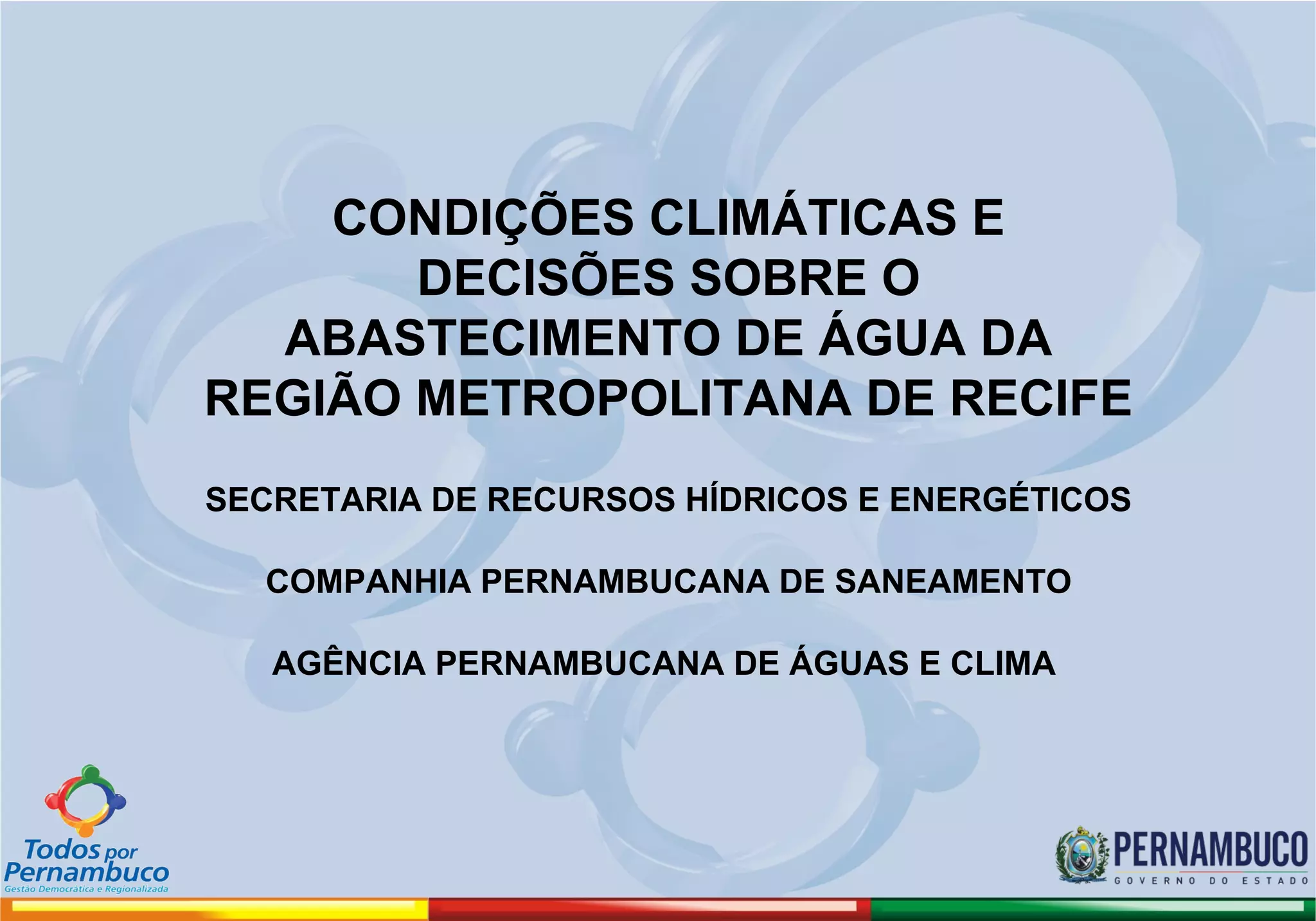 O documento discute as condições climáticas e decisões sobre o abastecimento de água na Região Metropolitana de Recife. A chuva em 2012 e 2013 foi abaixo da média histórica, levando a níveis baixos nas barragens. Isso pode exigir a redução da retirada de água da barragem de Pirapama para 2.500 l/s, o que poderia levar o volume útil a apenas 12% da capacidade em agosto. O documento também discute investimentos em novos reservatórios para aumentar a