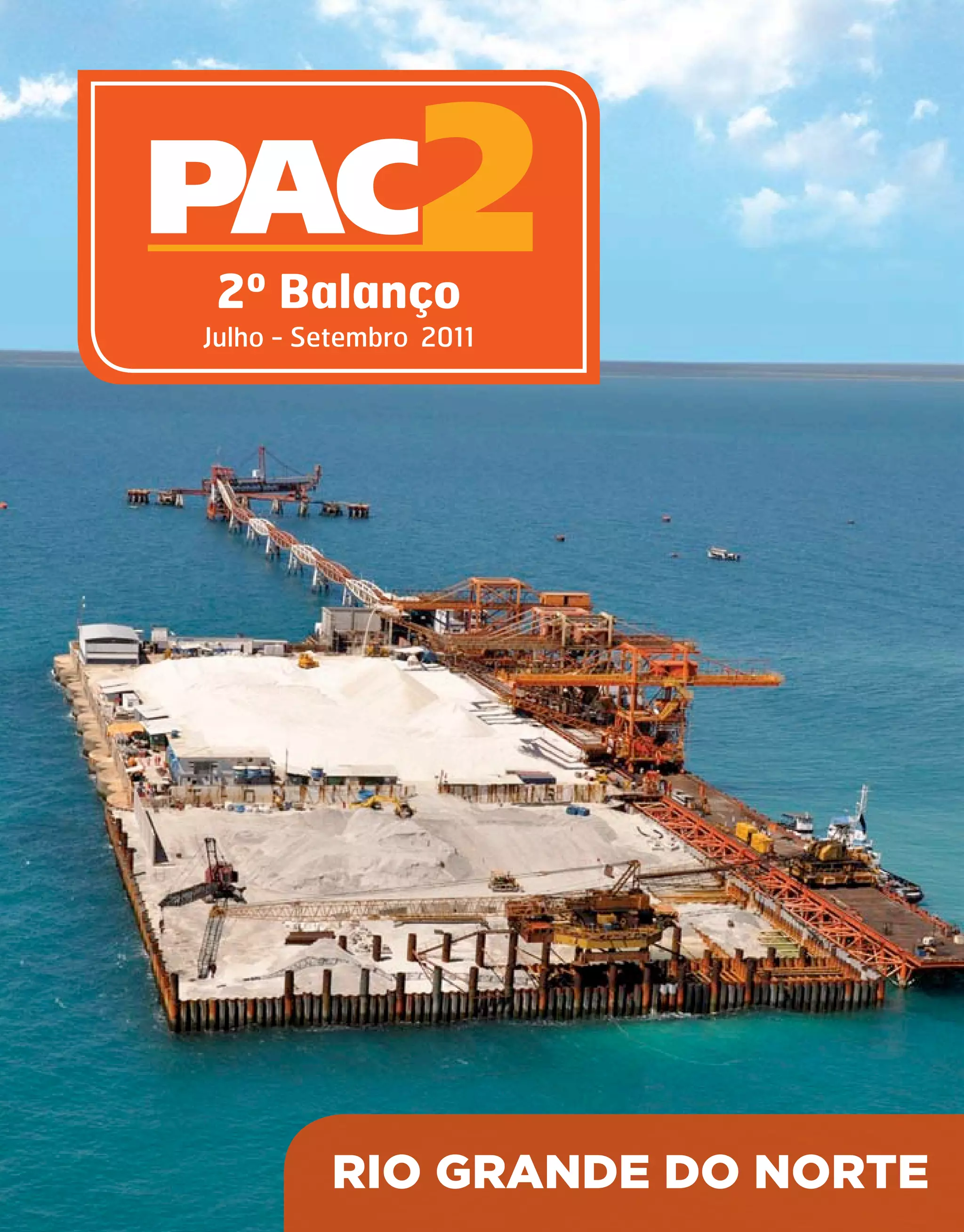 O documento apresenta o balanço do PAC 2 no Rio Grande do Norte entre julho e setembro de 2011. O investimento total no estado é de R$38,98 bilhões, sendo R$20,85 bilhões entre 2011-2014. Grandes projetos incluem usinas eólicas, obras portuárias e aeroportuárias. Até setembro de 2011, a execução foi de R$143,6 bilhões ou 15% do total previsto para 2011-2014.