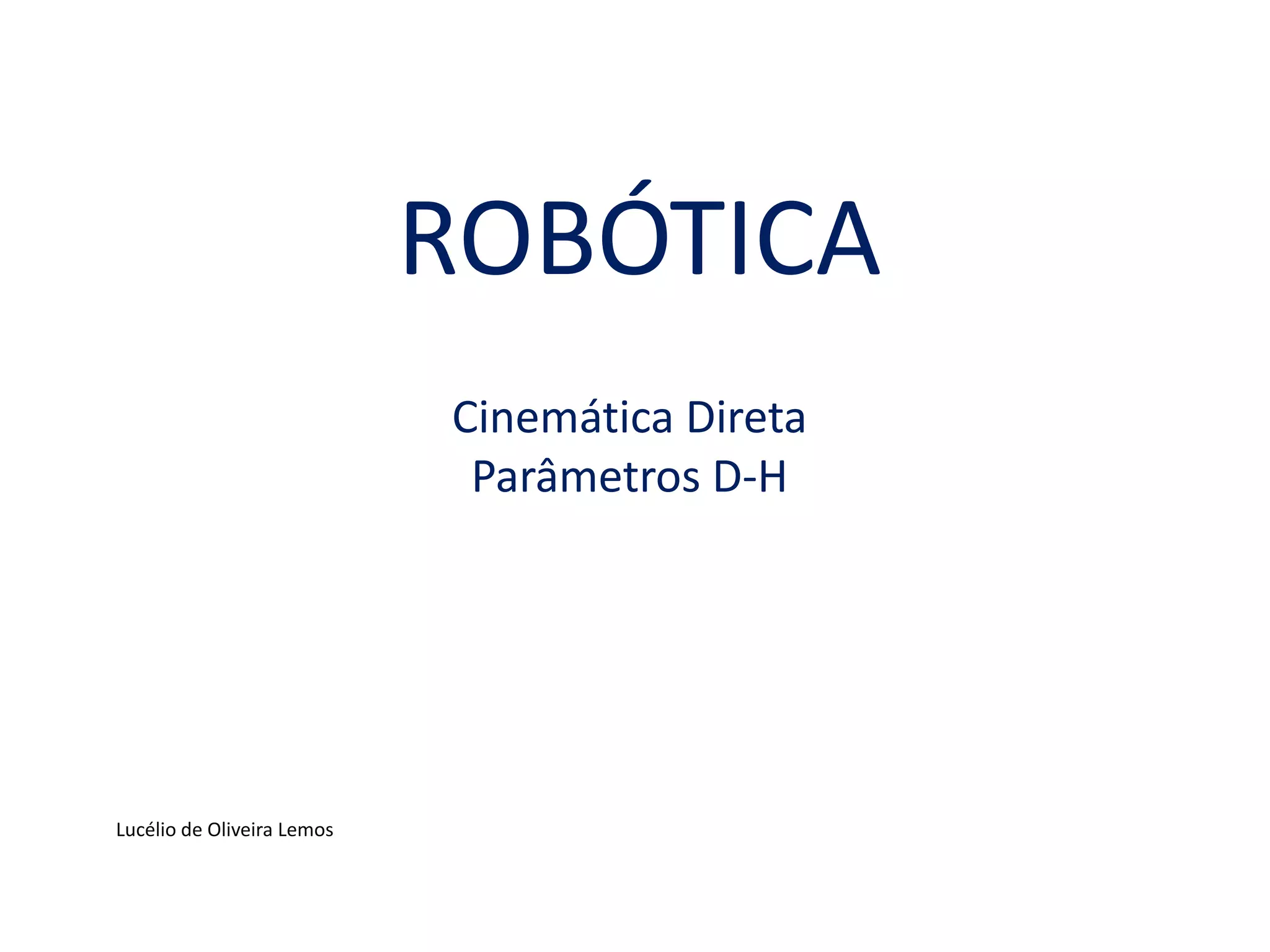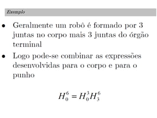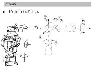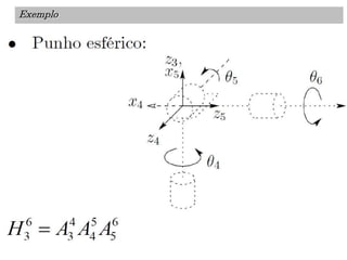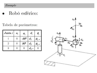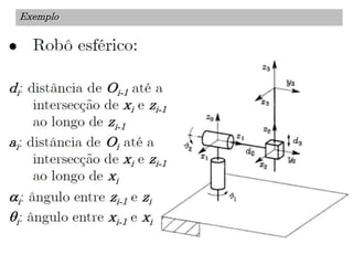O documento discute a notação de Denavit-Hartenberg para representar a cinemática de robôs. Ele explica como escolher os sistemas de coordenadas para cada junta e como os parâmetros de Denavit-Hartenberg (a, α, d e θ) definem a posição relativa entre sistemas de coordenadas consecutivos. Também aborda exceções à notação e como aplicá-la para obter as equações da cinemática direta de um robô.