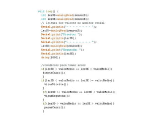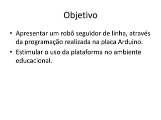 Este documento apresenta um projeto de um robô seguidor de linha desenvolvido na placa Arduino. O objetivo foi apresentar como a programação na Arduino pode ser usada para fins educacionais, estimulando o uso da plataforma no ensino. O documento descreve o que é a Arduino, os componentes usados no robô, como foi feita a programação e montagem, e conclusões sobre o que foi aprendido com o projeto.