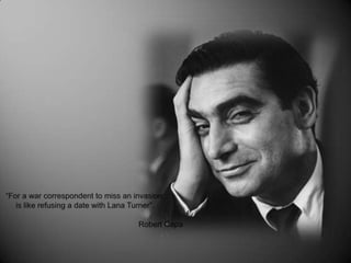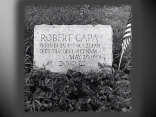 Robert Capa foi um fotógrafo de guerra húngaro que cobriu os principais conflitos da primeira metade do século XX, incluindo a Guerra Civil Espanhola e a Segunda Guerra Mundial. Ele adotou o nome Robert Capa para fins profissionais e trabalhou para a revista Life. Capa morreu em 1954 ao pisar em uma mina terrestre durante a Guerra da Indochina.