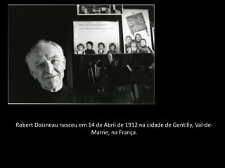 Robert Doisneau foi um fotógrafo francês nascido em 1912 conhecido por suas fotografias que capturavam a essência da vida cotidiana em Paris. Sua foto mais famosa, "Le baiser de I’Hôtel de Ville", mostra um casal se beijando. Doisneau trabalhou para a revista Vogue entre 1949-1952 e se tornou reconhecido por suas imagens capturadas nos arredores de Paris.