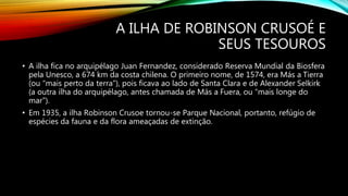 A ilha de Robinson Crusoé é uma reserva ecológica no Oceano Pacífico que abriga espécies ameaçadas. A ilha sofreu um terremoto e tsunami em 2010 que causou grandes ondas. Sua população vem diminuindo à medida que os jovens migram para o continente em busca de melhores oportunidades.