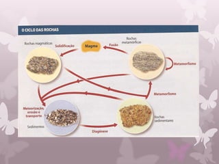 Este documento apresenta informações sobre diferentes tipos de rochas, incluindo sua formação e características das paisagens associadas. Discutem-se rochas magmáticas, sedimentares e metamórficas, além do ciclo das rochas. O documento contém 33 slides com detalhes sobre cada tipo de rocha.