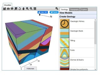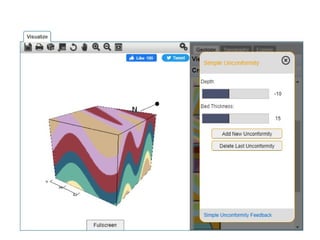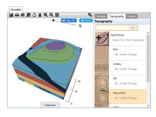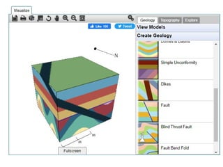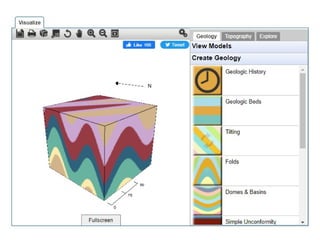 Este documento apresenta conceitos fundamentais de estratigrafia e estrutura geológica, como tempo geológico, Antropoceno, modelagem 3D de estratigrafia, notações de orientação tridimensional, formação de estruturas geológicas por dobramentos, falhas e intrusões, e efeitos do relevo sobre mapas geológicos. O documento também descreve simulações interativas destes conceitos usando um software online.