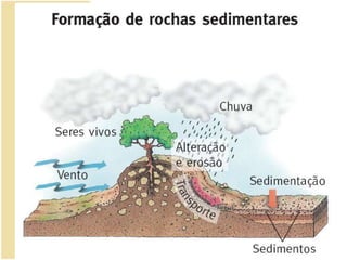1) Rochas sedimentares formam-se perto da superfície terrestre e dispõem-se em estratos que podem conter fósseis.