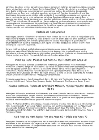 O documento discute os perigos da música rock religiosa, comparando-a a um sapo colocado em água quente gradualmente. Afirma que a música rock promove imoralidade, drogas e satanismo, e que sua entrada nas igrejas mostra o declínio moral e espiritual. Adverte os cristãos a não se conformarem com este mundo e permanecerem santos.