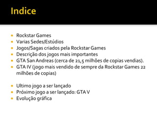 Este documento descreve a empresa de jogos Rockstar Games, conhecida por criar a série Grand Theft Auto. Detalha as várias sedes e estúdios da Rockstar ao redor do mundo e os jogos populares que criou, como GTA San Andreas, GTA IV, Red Dead Redemption e Bully. Também discute a evolução gráfica dos jogos da Rockstar ao longo dos anos.