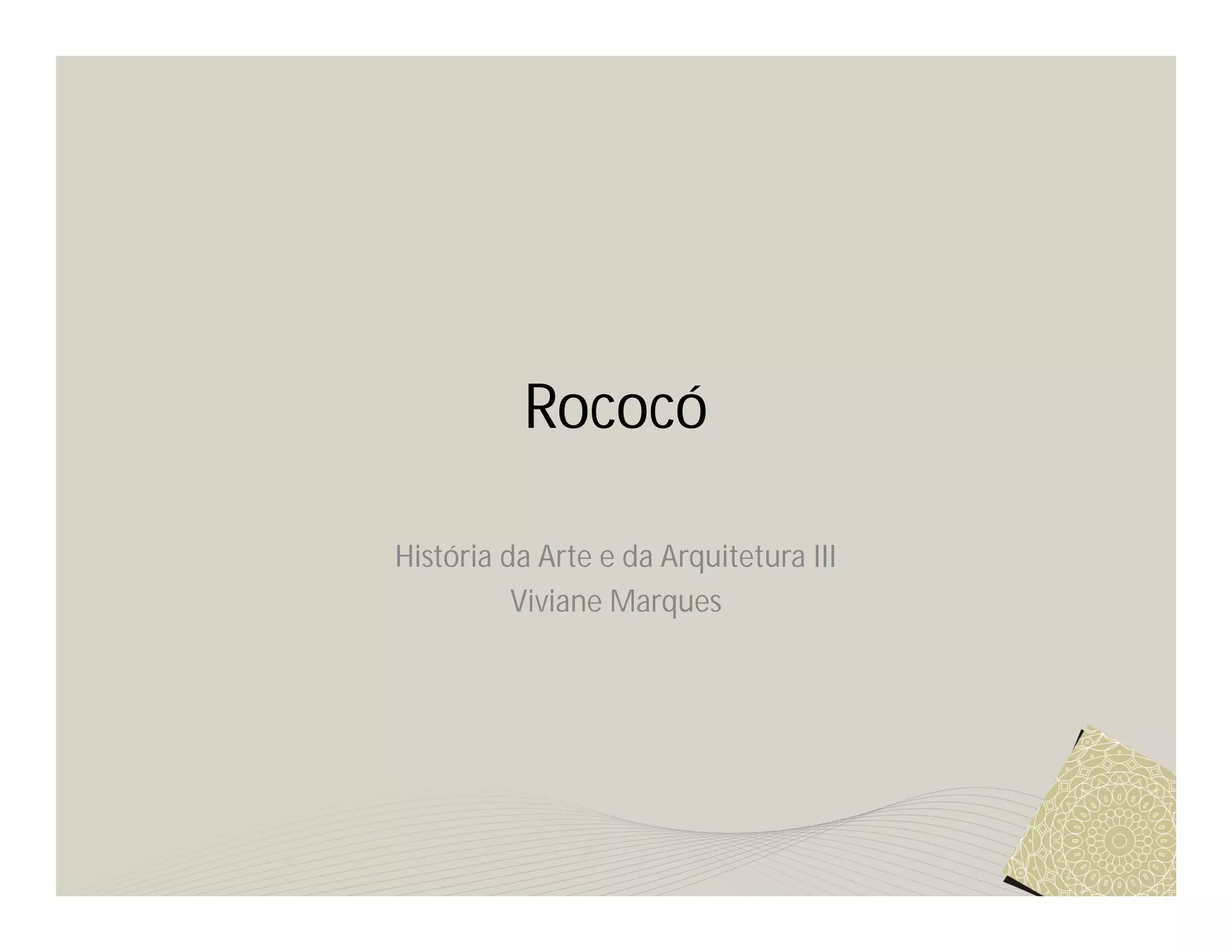 O estilo Rococó surgiu entre 1730-1780 na Alemanha, Áustria e França. Caracteriza-se por formas orgânicas e curvas, cores pastéis, assimetria e detalhes decorativos inspirados na natureza. A arquitetura Rococó enfatiza a decoração luxuosa nos interiores e exteriores dos palácios, com ênfase na leveza e na luz.