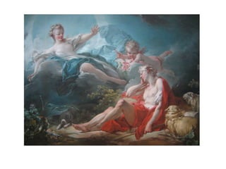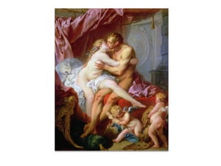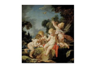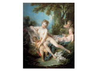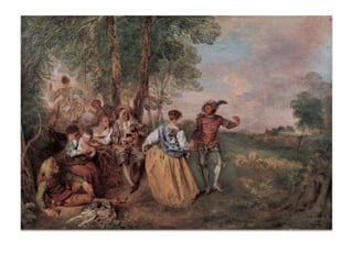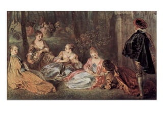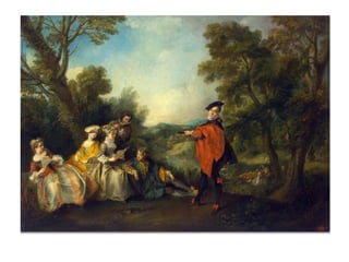 O documento explora o período do Rococó no século XVIII, destacando as mudanças políticas, econômicas e sociais que impulsionaram um novo dinamismo cultural e educativo, influenciado pelo Iluminismo. O Rococó é descrito como um movimento estético hedonista e individualista, que privilegiou a beleza, intimidade e o conforto na arte, arquitetura e decoração, e teve grande aceitação na Europa, especialmente na França. As expressões artísticas desse período abrangeram pintura, escultura e arquitetura, enfatizando temas leves e a valorização do indivíduo como centro do conhecimento e da criatividade.