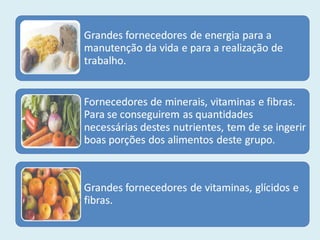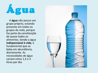A roda dos alimentos ensina sobre a importância da água para a vida e uma alimentação balanceada, completa e variada, comendo alimentos de todos os grupos da roda dos alimentos em quantidades apropriadas e bebendo de 1,5 a 3 litros de água por dia.